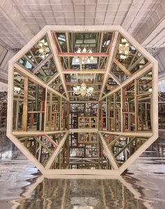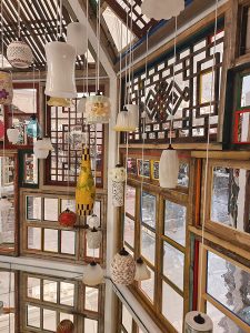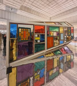 Au cœur du magasin, autour de l’escalator central, Song Dong dévoile deux chandeliers monumentaux suspendus sous les verrières. Composés de six anneaux en acier ornés de bouteilles éclairées de blanc, ils évoquent les pampilles scintillantes d’un lustre tout en détournant les matériaux du quotidien. Le long des garde-corps, l’artiste déploie des rideaux reprenant son motif emblématique de fenêtres colorées. Au deuxième étage, une installation immersive invite les visiteurs à une expérience plus intime. Le restaurant Primo Piano accueille également une douzaine de dessins originaux qui témoignent du processus créatif de Song Dong, essentiels à la conception du projet.