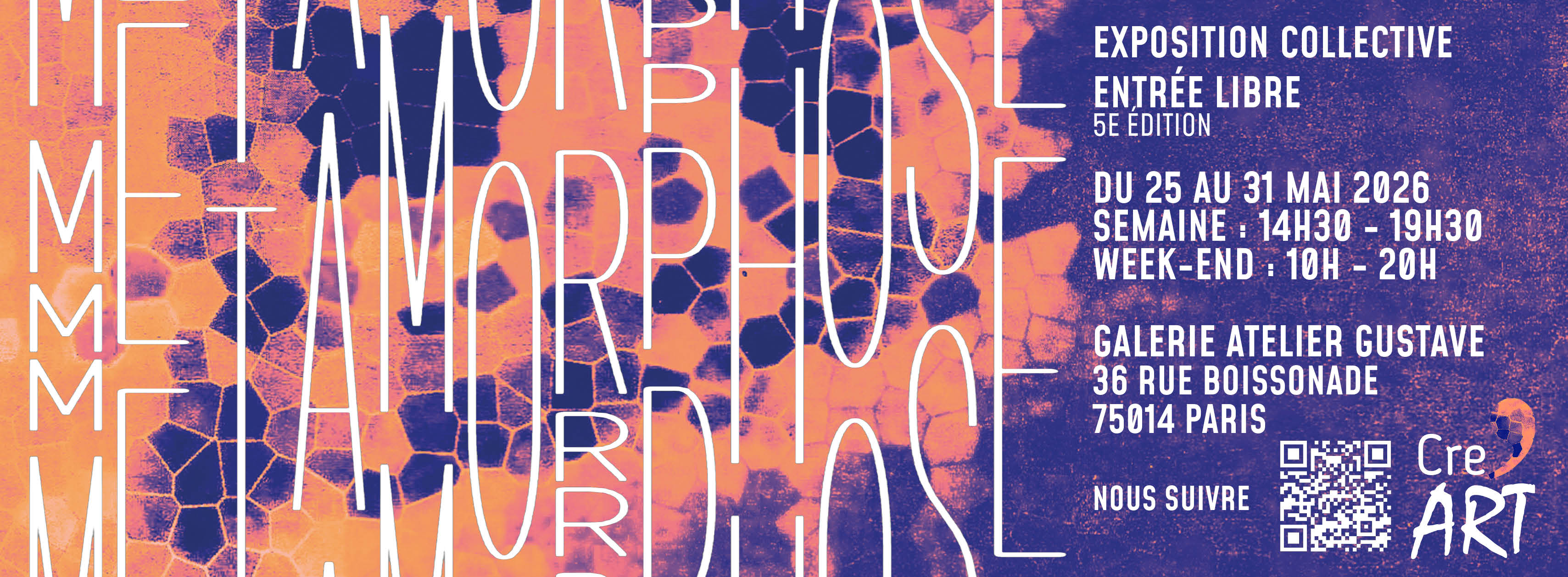 METAMORPHOSE, la 5ᵉ édition de l’exposition collective portée par l’Association Cre’Art, se tiendra du 25 au 31 mai 2026 à la Galerie Atelier Gustave (36 rue Boissonade, Paris 14ᵉ). Cet événement met à l’honneur la diversité de la création contemporaine à travers une sélection d’œuvres mêlant photographie, installations, arts graphiques, textile et collages, réunissant artistes émergents et confirmés. Ouverte à tous et en entrée libre, l’exposition invite chacun à découvrir, échanger et s’immerger dans des univers artistiques riches et inspirants.